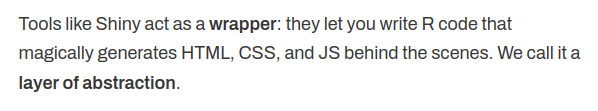Il n’y a pas un outil qui est meilleur que les autres. Chaque outil a son usage dans son contexte. Par exemple, en tant qu’expert R et Shiny, j’utilise quand même Excel quasi-quotidiennement pour certaines tâches. Là où Yan se trompe, c’est qu’il définit Shiny comme un wrapper. Selon lui, c’est juste un moyen d’écrire du code R qui va magiquement générer du HTML, du CSS, et du JS. Et ce wrapper a un coût :
