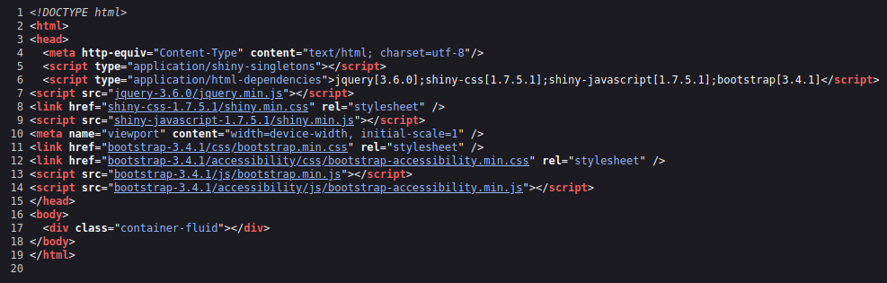 Les outils de ShinyQuand vous créez une application Shiny, vous utilisez : 1. Le package htmltools facilite la personnalisation de l’interface utilisateur d’un projet Shiny en utilisant du code R pour générer du HTML, CSS, et JavaScript.C’est exactement la définition que donne Yan de Shiny : Ça permet d’utiliser du code R pour générer du HTML/CSS/JS. Et c’est vrai, 2. Le framework Bootstrap qui est importé par défaut pour les composants d’interface :